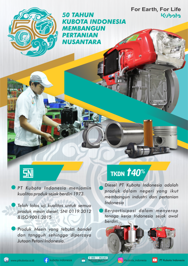 Menuju 50 tahun dengan membawa misi untuk terus meningkatkan kualitas, mutu, dan kontribusi untuk negeri. #Kubota #ForEarthForLife
